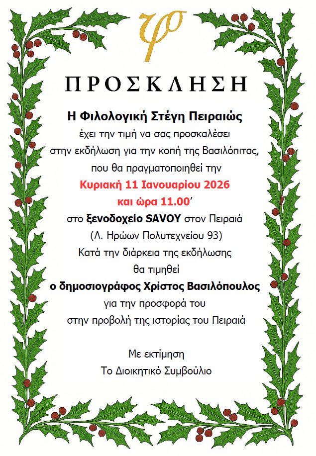 Η Φιλολογική Στέγη Πειραιώς έχει την τιμή να σας προσκαλέσει στην εκδήλωση για την κοπή της Βασιλόπιτας, που θα πραγματοποιηθεί την Κυριακή 11 Ιανουαρίου 2026 και ώρα 11.00’ στο ξενοδοχείο SAVOYστον Πειραιά (Λ. Ηρώων Πολυτεχνείου 93) Κατά την διάρκεια της εκδήλωσης θα τιμηθεί ο δημοσιογράφος Χρίστος Βασιλόπουλος για την προσφορά του στην προβολή της ιστορίας […]