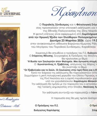 Ο Πειραϊκός Σύνδεσμος και η Φιλολογική Στέγη Πειραιώς σας προσκαλούν στην επετειακή εκδήλωση για τον εορτασμό της Εθνικής Παλιγγενεσίας της 25ης Μαρτίου 1821. Η φετινή επέτειος είναι αφιερωμένη στη Συμπλήρωση των 200 ετών από την Ηρωική Έξοδο των Ελεύθερων Πολιορκημένων του Μεσολογγίου Δευτέρα 23 Μαρτίου 2026, ώρα 19.00 στην αίθουσα Βαρώνου Κίμωνος Ράλλη του Πειραϊκού […]