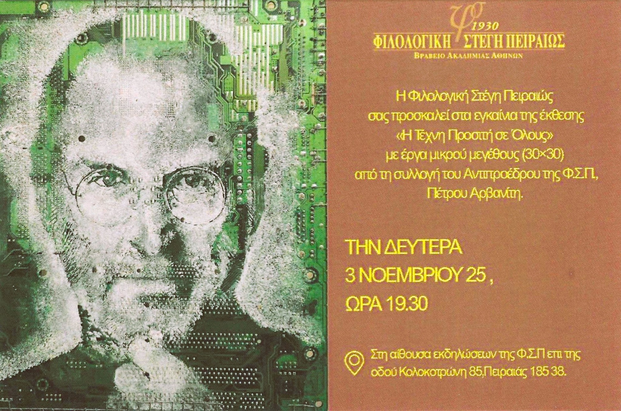 Η Φιλολογική Στέγη Πειραιώς σας προσκαλεί στα εγκαίνια της έκθεσης “Η Τέχνη Προσιτή σε Όλους” με έργα μικρού μεγέθους (30Χ30) από τη συλλογή του Αντιπροέδρου της ΦΣΠ, Πέτρου Αρβανίτη. ΤΗΝ ΔΕΥΤΕΡΑ 3 ΝΟΕΜΒΡΙΟΥ 2025, ΩΡΑ 19.30 Στην αίθουσα εκδηλώσεων της ΦΣΠ, επί της οδού Κολοκοτρώνη 85 στον Πειραιά.